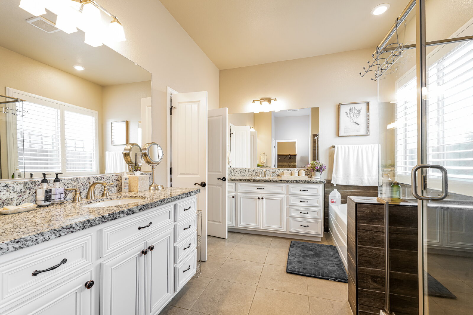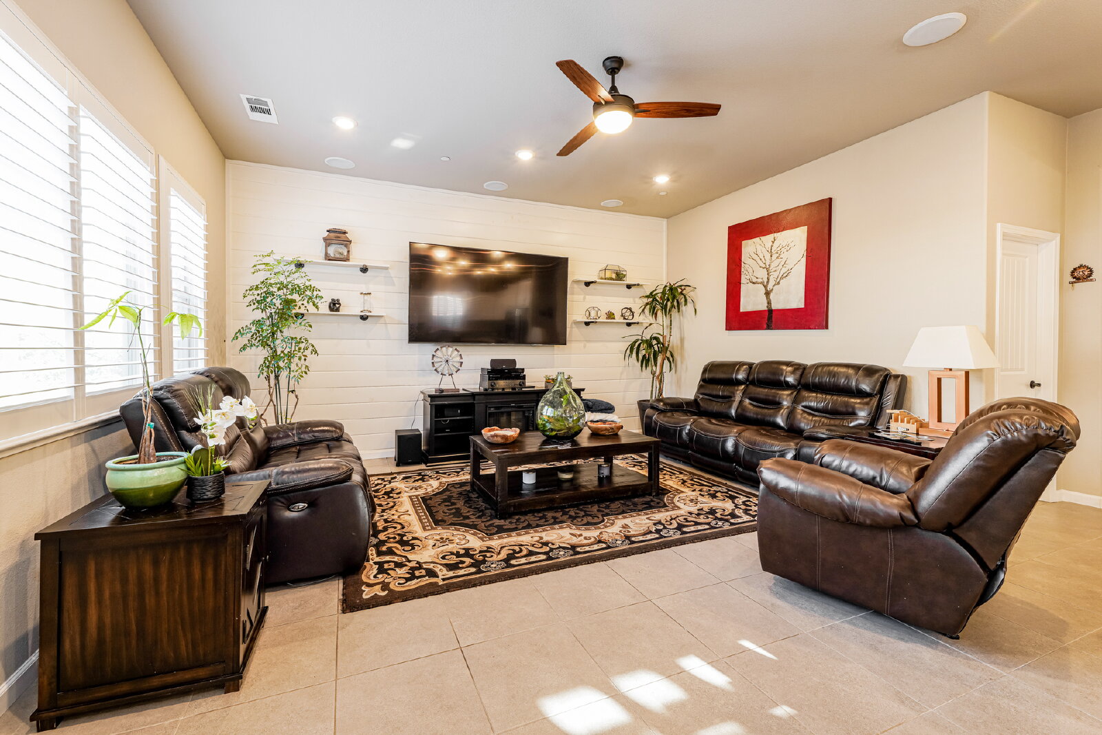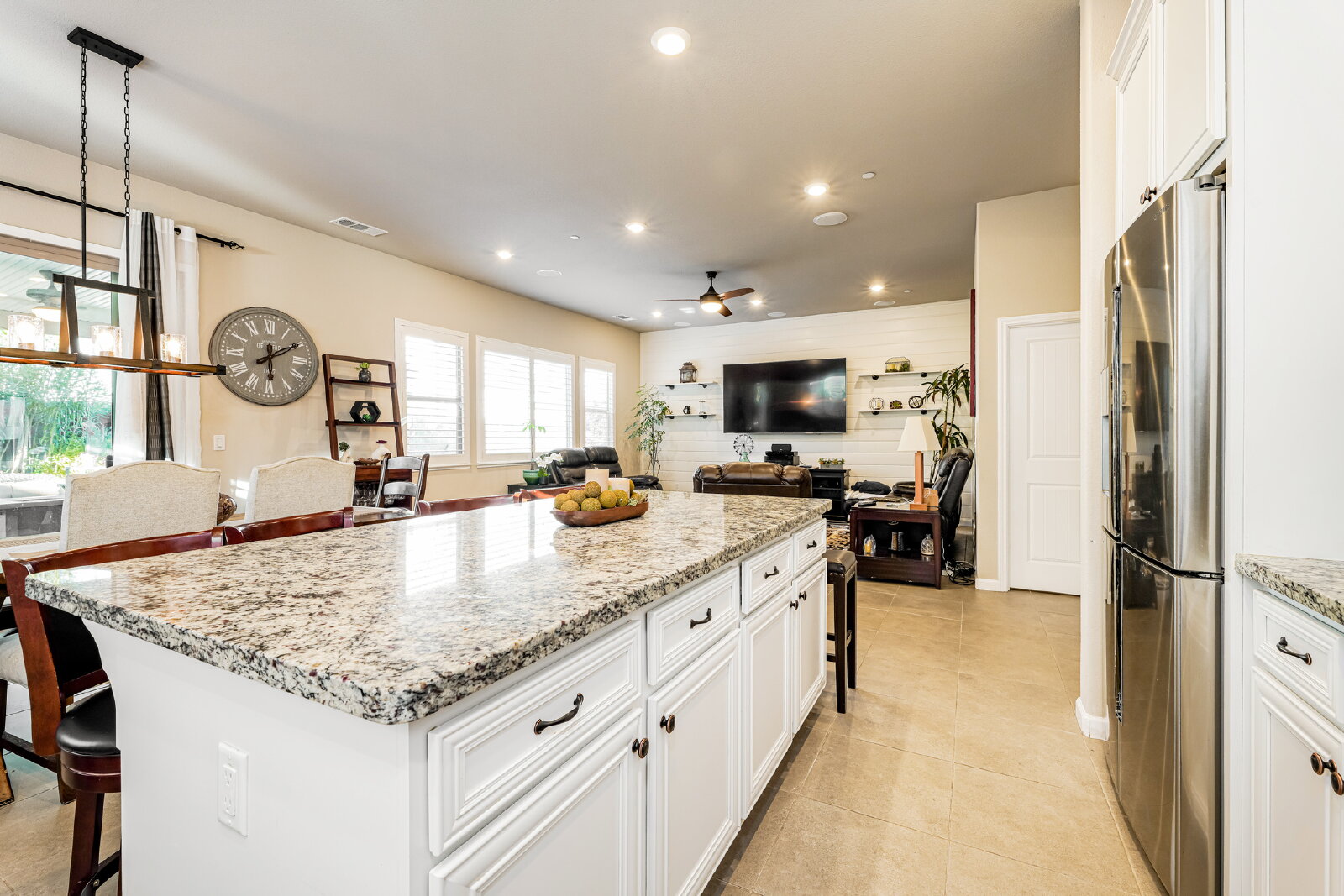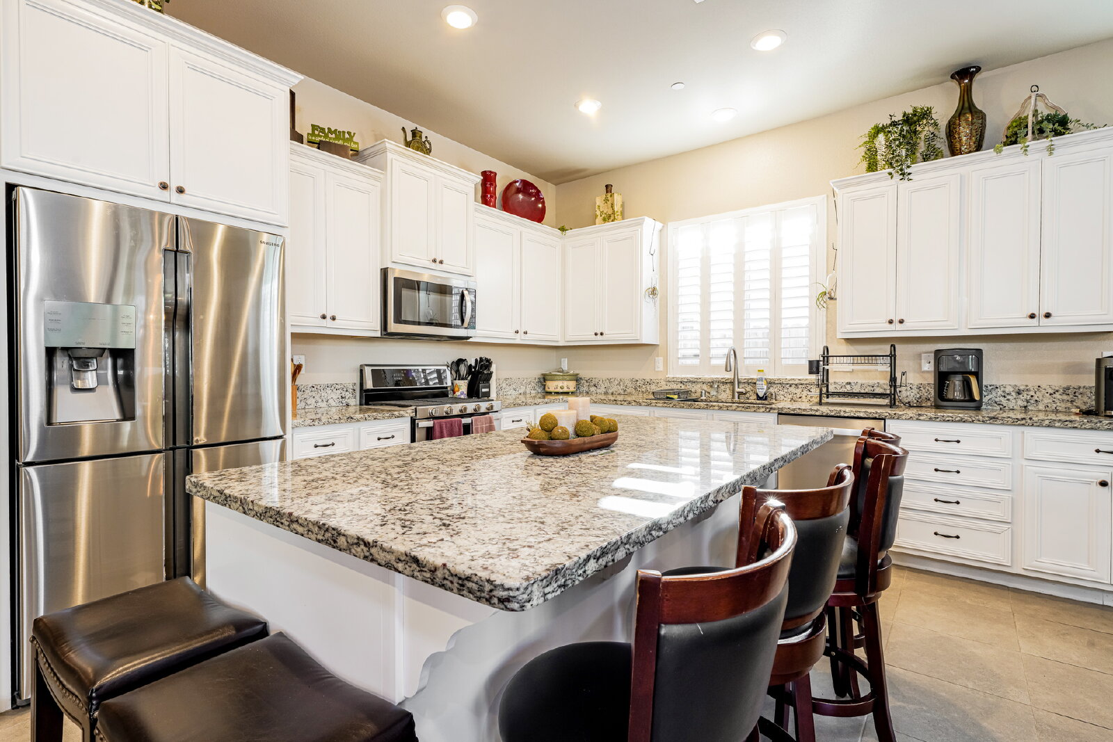 Step inside to discover designer touches and premium finishes throughout. Custom tile flooring and plush carpeting complement plantation shutters, while the gourmet kitchen dazzles with granite countertops, stainless steel appliances, and an instant-hot water feature. A bright, open family room, accented by a chic shiplap wall, creates a welcoming space for relaxation and entertaining. The luxurious master suite includes a separate Roman tub, walk-in shower, dual sinks, and a spacious closet.