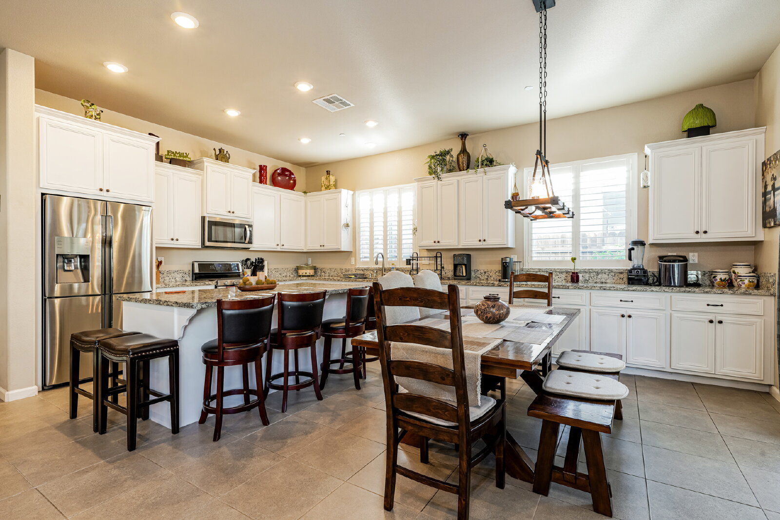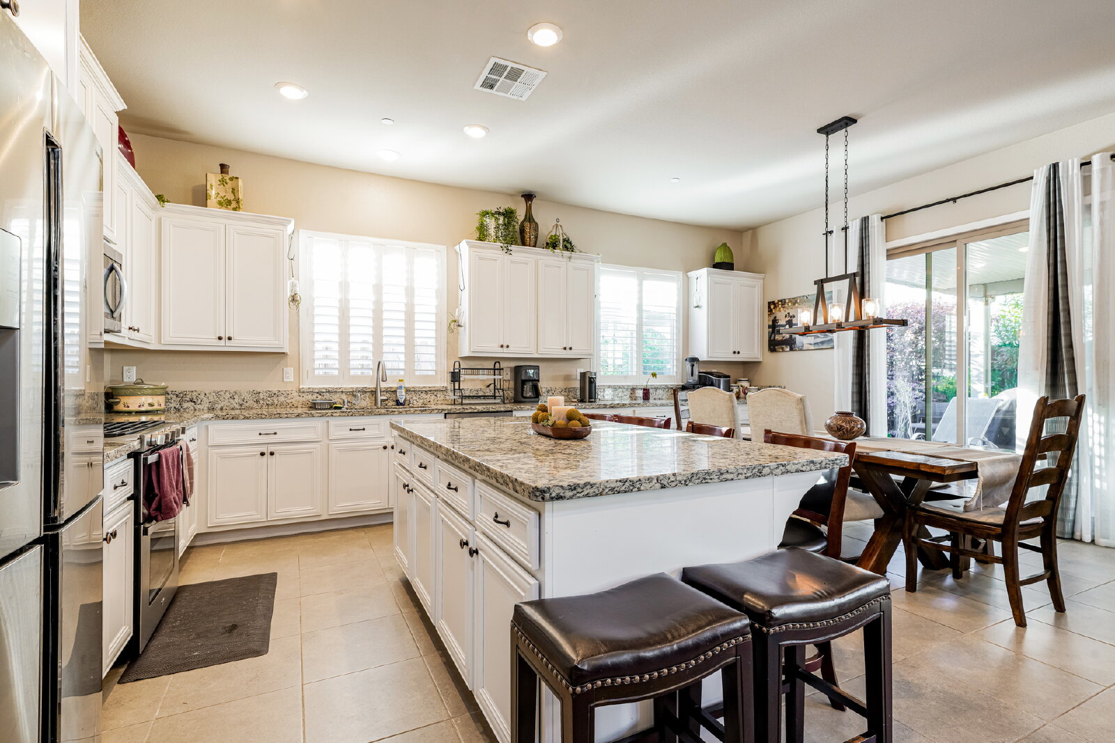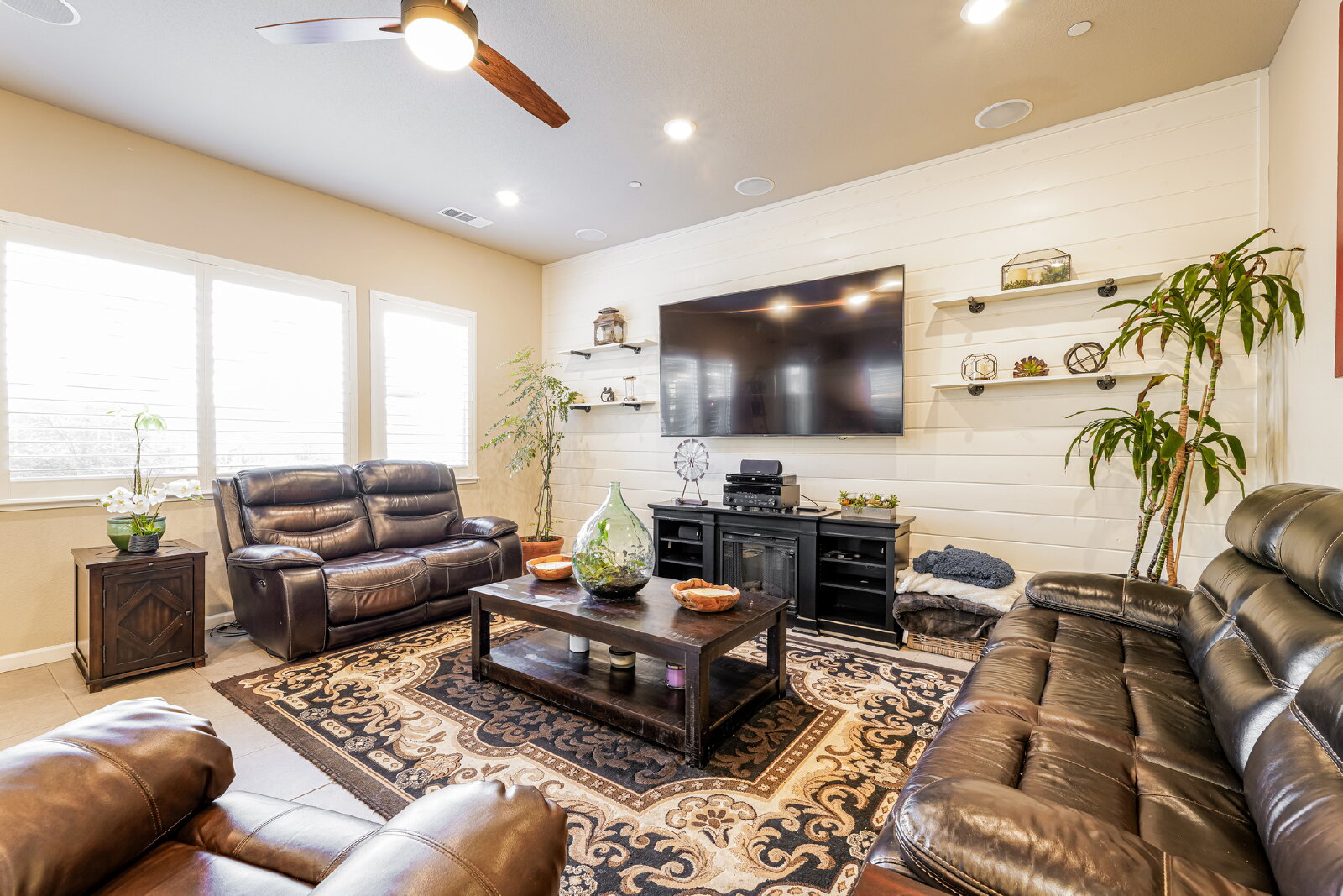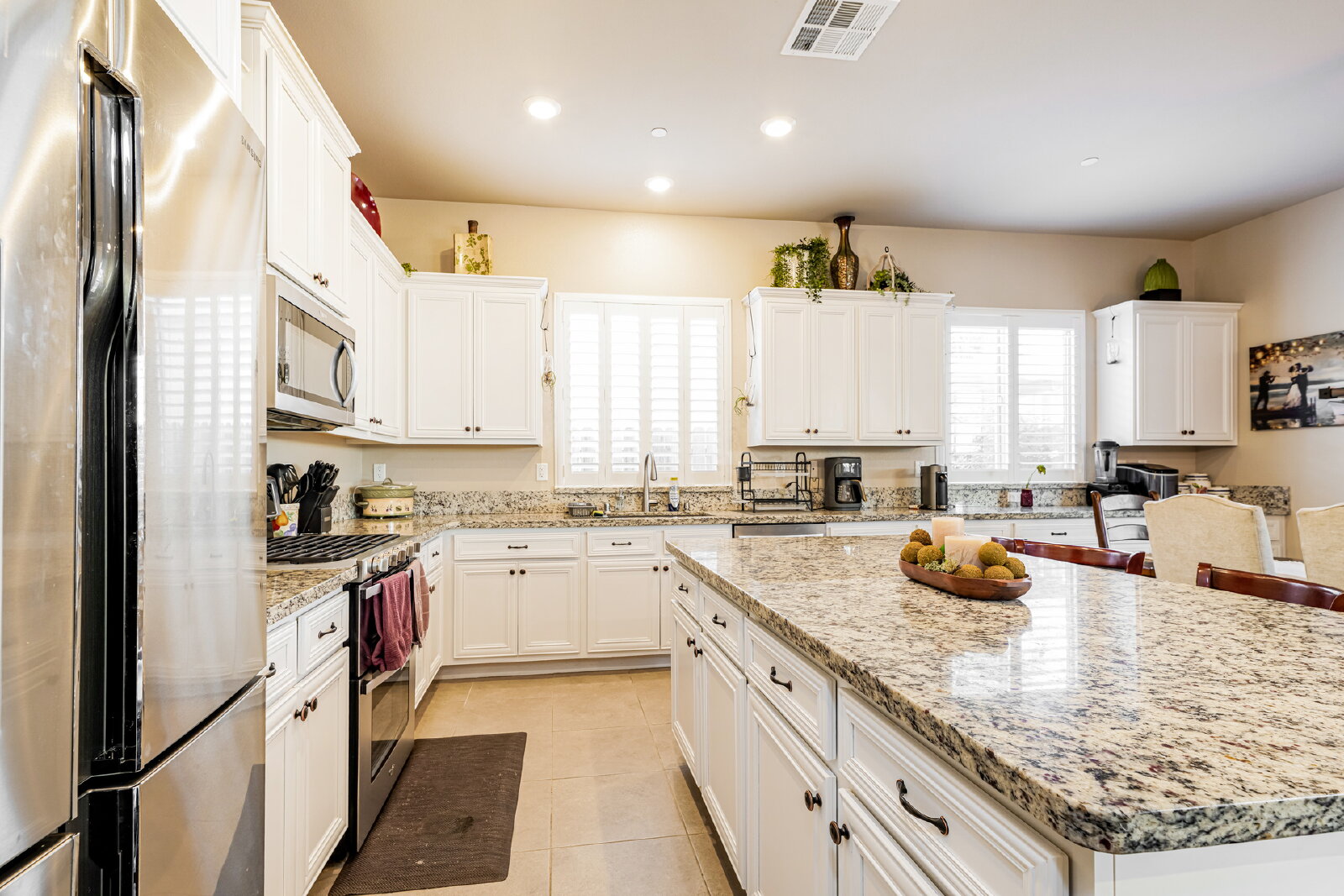 Step inside to discover designer touches and premium finishes throughout. Custom tile flooring and plush carpeting complement plantation shutters, while the gourmet kitchen dazzles with granite countertops, stainless steel appliances, and an instant-hot water feature. A bright, open family room, accented by a chic shiplap wall, creates a welcoming space for relaxation and entertaining. The luxurious master suite includes a separate Roman tub, walk-in shower, dual sinks, and a spacious closet.