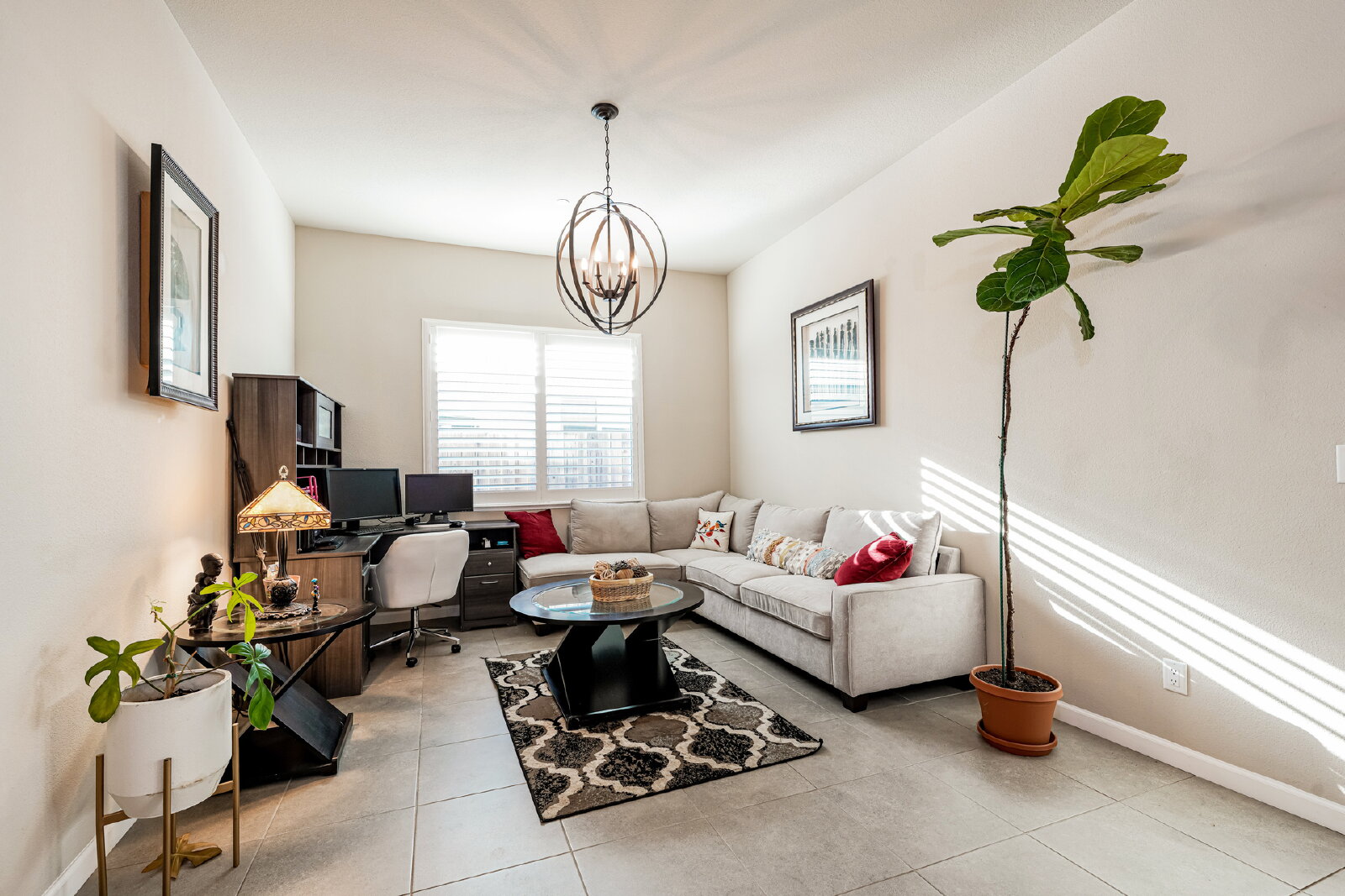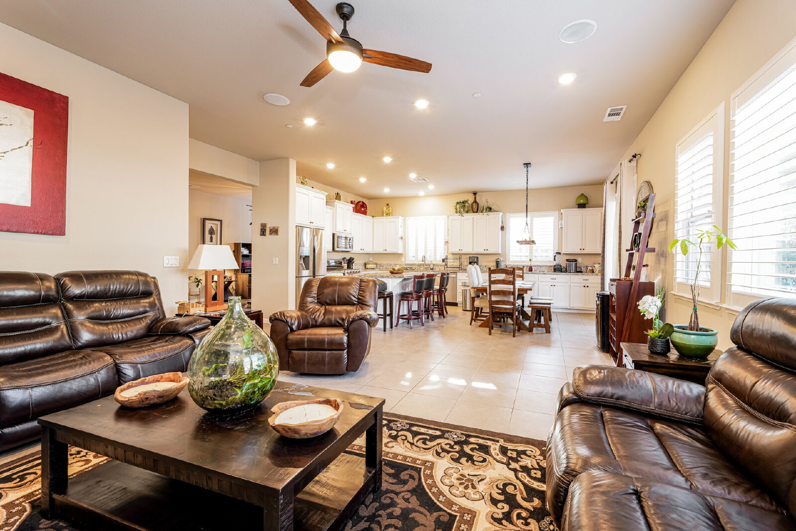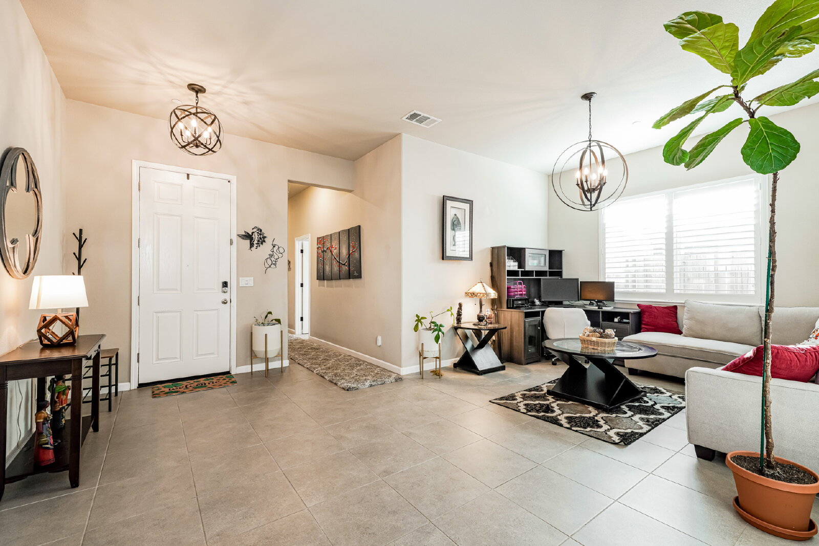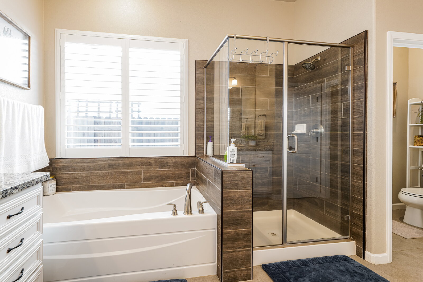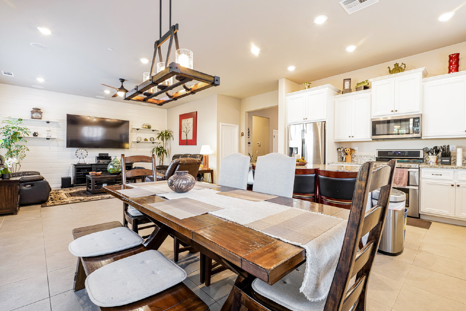 Step inside to discover designer touches and premium finishes throughout. Custom tile flooring and plush carpeting complement plantation shutters, while the gourmet kitchen dazzles with granite countertops, stainless steel appliances, and an instant-hot water feature. A bright, open family room, accented by a chic shiplap wall, creates a welcoming space for relaxation and entertaining. The luxurious master suite includes a separate Roman tub, walk-in shower, dual sinks, and a spacious closet.