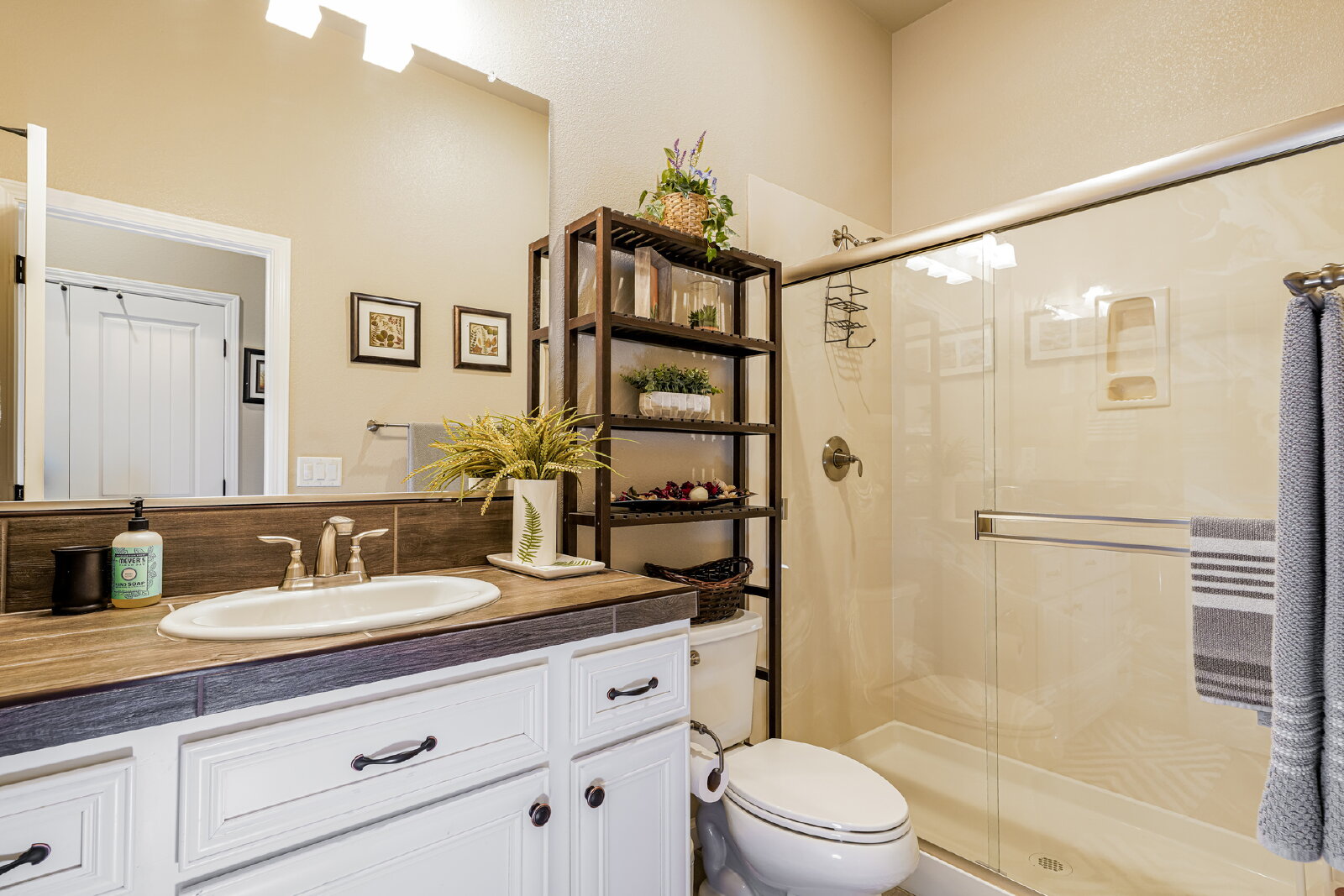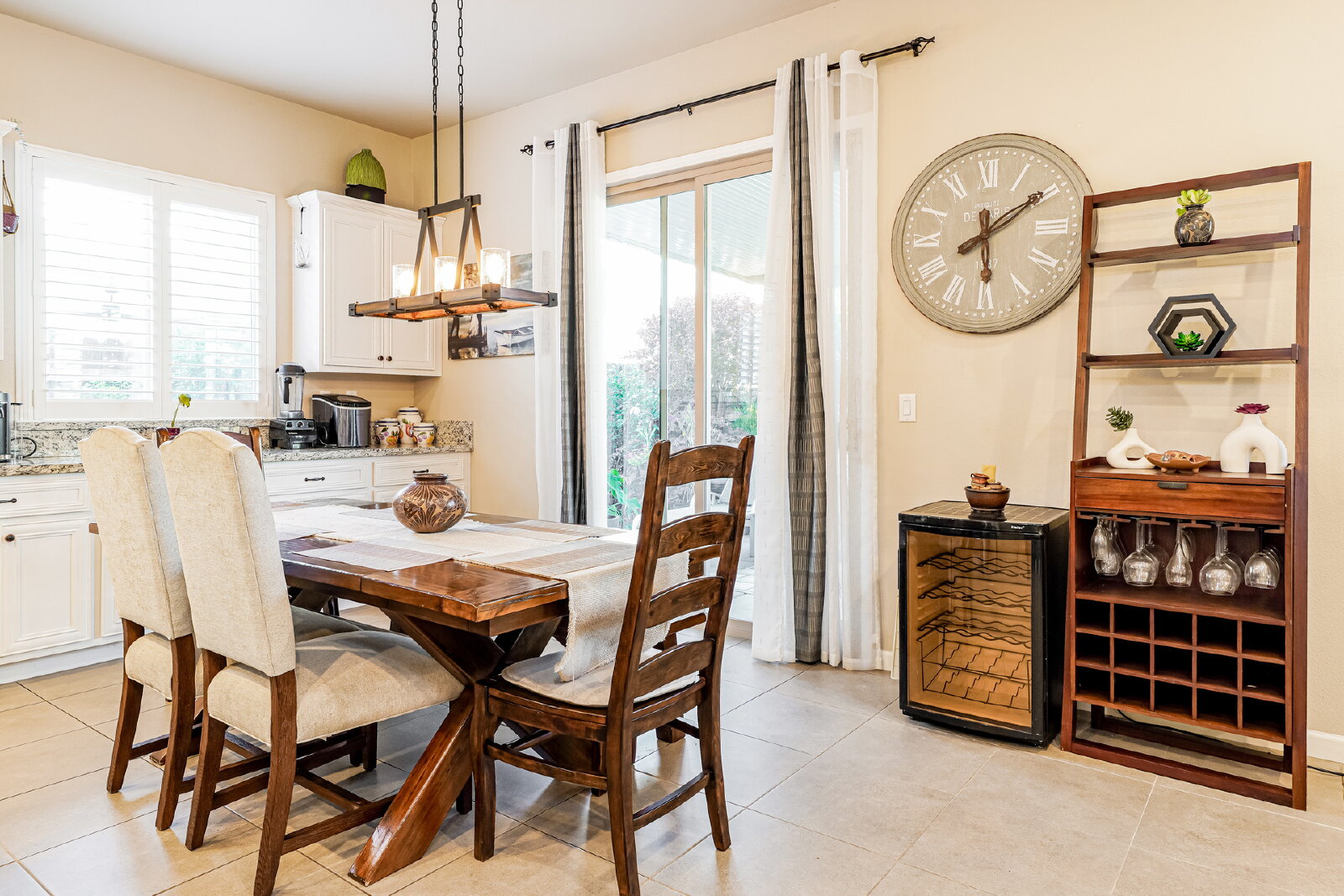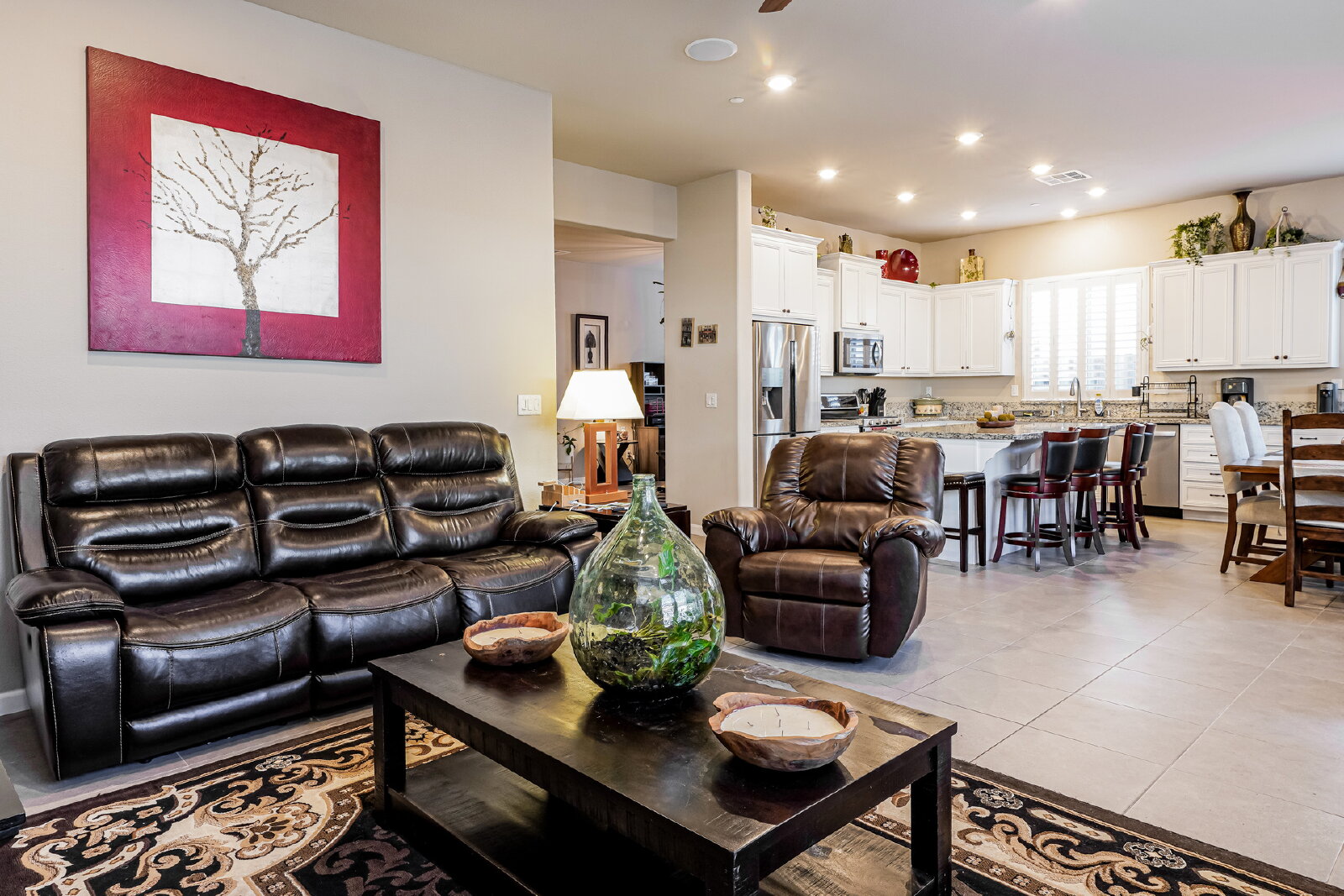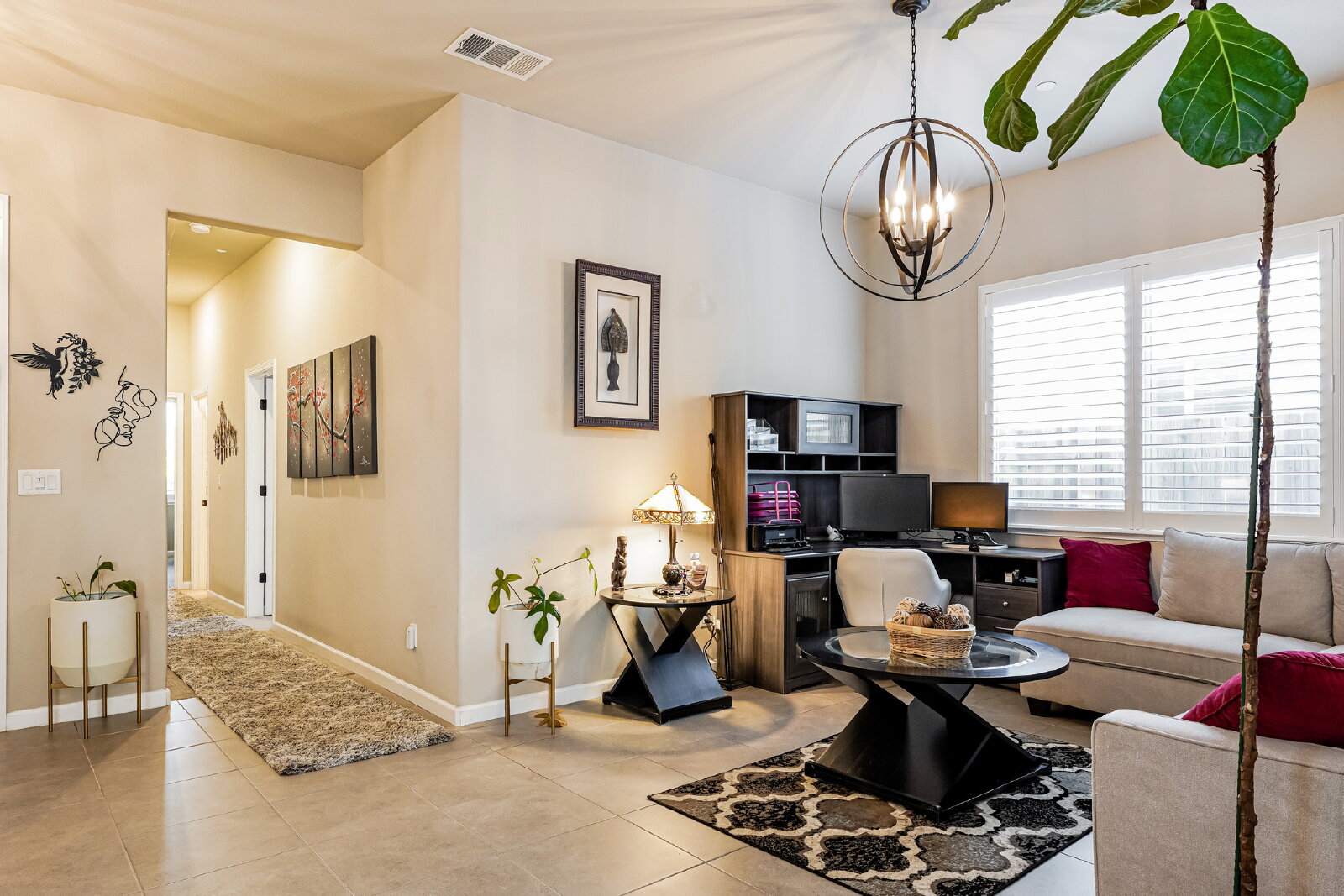 Step inside to discover designer touches and premium finishes throughout. Custom tile flooring and plush carpeting complement plantation shutters, while the gourmet kitchen dazzles with granite countertops, stainless steel appliances, and an instant-hot water feature. A bright, open family room, accented by a chic shiplap wall, creates a welcoming space for relaxation and entertaining. The luxurious master suite includes a separate Roman tub, walk-in shower, dual sinks, and a spacious closet.